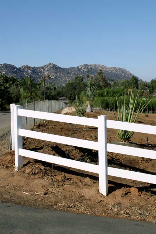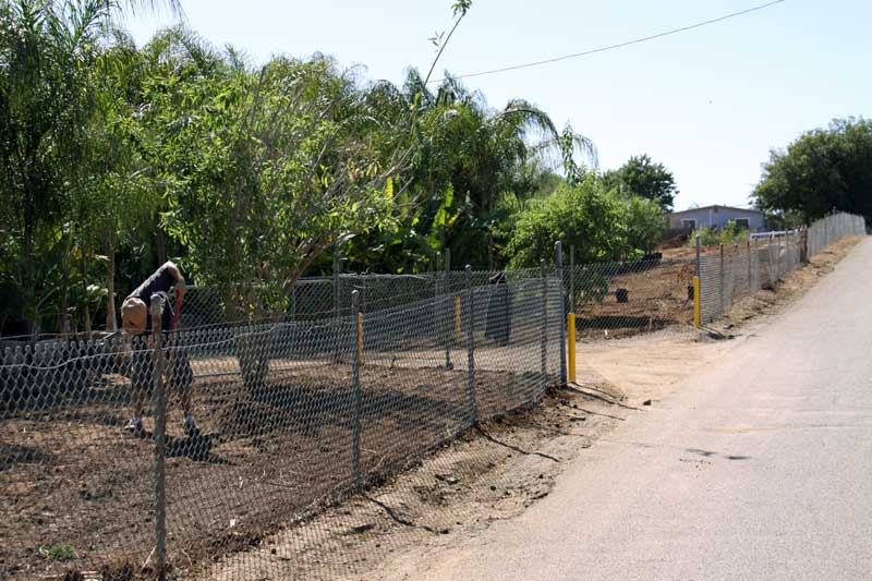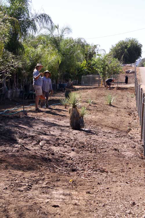 This 500' x 18' parkway in front of the nursey land was a huge bonus that came with the property. Although this strip is legally owned by the County, it's not likely they will ever use it, The strip lies inside our private fence and the County only requires/allows us to maintain and landscape it in a presentable manner. It was a mess when we moved in- open trenches, big piles of dirt, mystery piping and nasty Queen palms. Petra has been working on it sporadically ever since, finally arriving at a point a couple of weeks ago where the grader could come in and even it all out. Here Petra and Amalia discuss how to make cash crops pass for landscaping.