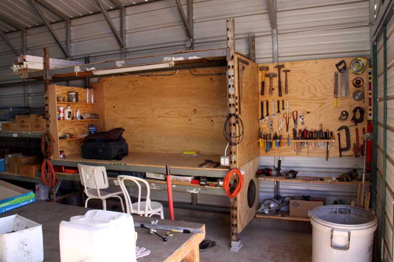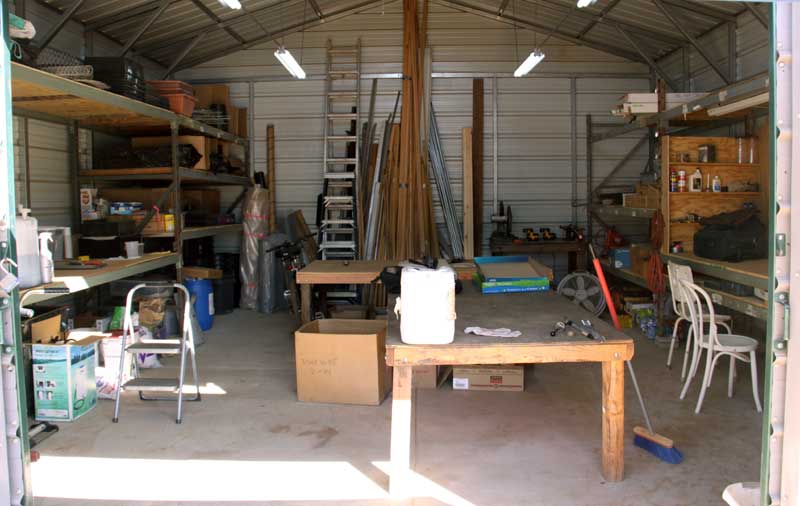 The intense heat in the afternoons often drove us indoors, affording opportunities to establish order in the shed. Lights are up and shelves built along both sides. Ah, civilization!