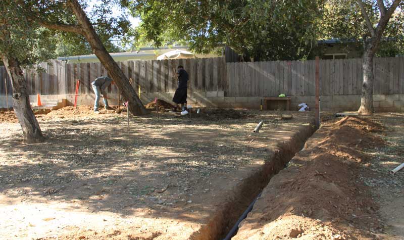 Of course, the trailer will eventually find its home in that coppice of oak trees next door at the annex. We are already working on installing the services to that area. On the right, the water line is in and working. Back against the fence, Brian and Miguel dig the trench for the septic line. After that, we'll work on getting electricity up there. We expect to be ready to move the trailer over sometime next month.