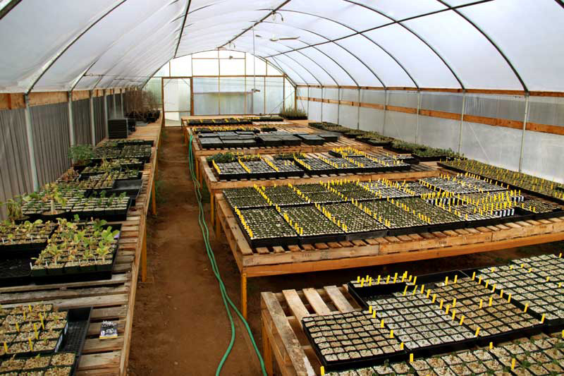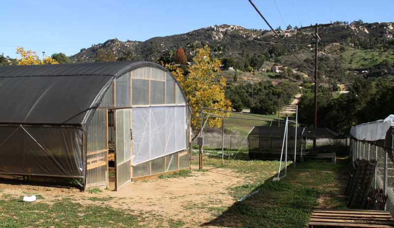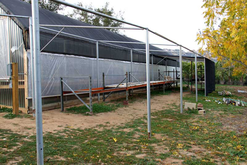 Outside on the east side of the kindergarten, we are in the process of setting up a new shaded corridor for winter growing seedlings. Petra has already put down most of her winter seed and, so far, it looks like another bumper crop! These babies won't mind the cold, but some of them are averse to too much water (i.e., rain), so we've covered the north 20' with Lexan. Eventually the whole corridor will be shrouded in shade cloth. Planned for that blank space along the right side is another 40' of ground beds.
