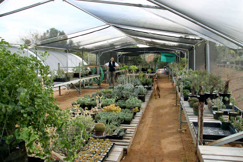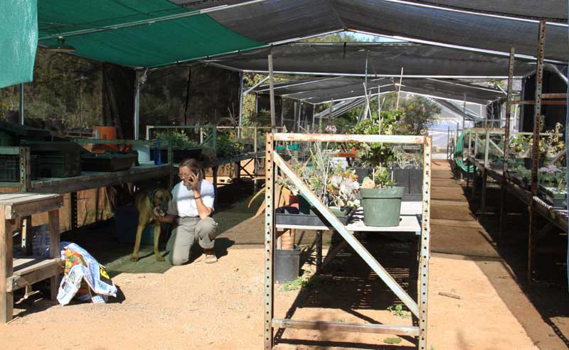Petra "multi-tasks" in front of her shade level potting bench.