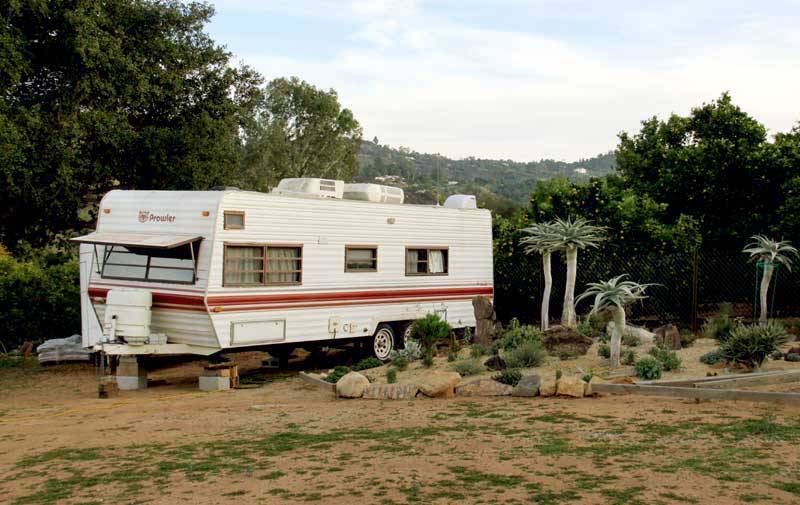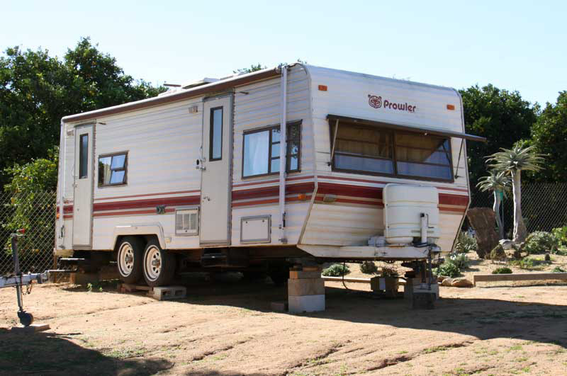 The trailer is a fairly old model (1984), but all of the systems- propane heat, stove, full-size refrigerator, water heater, roll-down awning and air conditioner- are of good quality and in fine working order. And it has a reasonably roomy shower! The two doors were also an attractive feature, giving us two separable bedrooms.