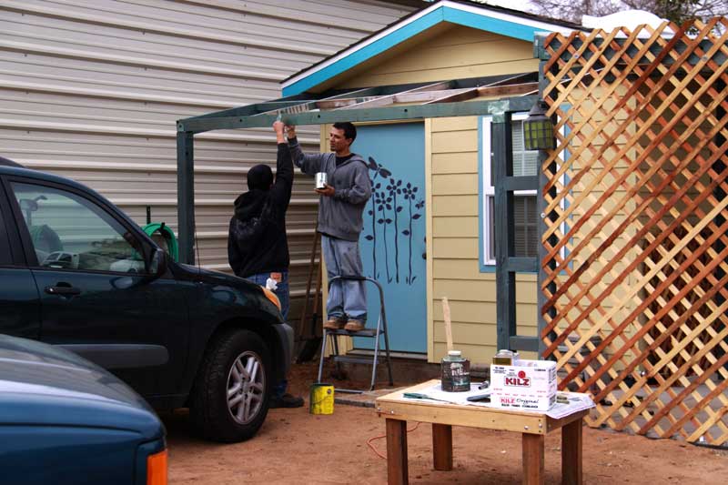 Brian and Carlos paint the framing over our new front porch.
