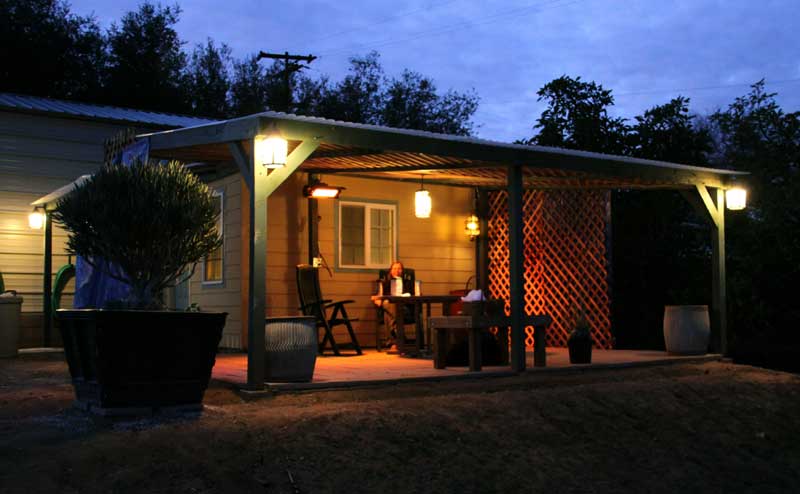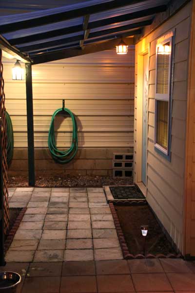 The completed porch and breezeway with our quaint lighting in place. We have yet to cover the underside of the roof with lattice. Petra has plans for a little rock garden in that planter against the house.