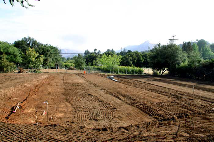 We had a pro with a dozer come in and grade the bottom (eastern) half of the parcel. He did a beautiful job, creating two pads, each roughly 30' wide by 100' long, with roads running along both ends. The lower pad will have a 96'x30' hoop house erected on it and the upper pad will have two 20'x20' shade structures and whatever else Petra decides to put there.