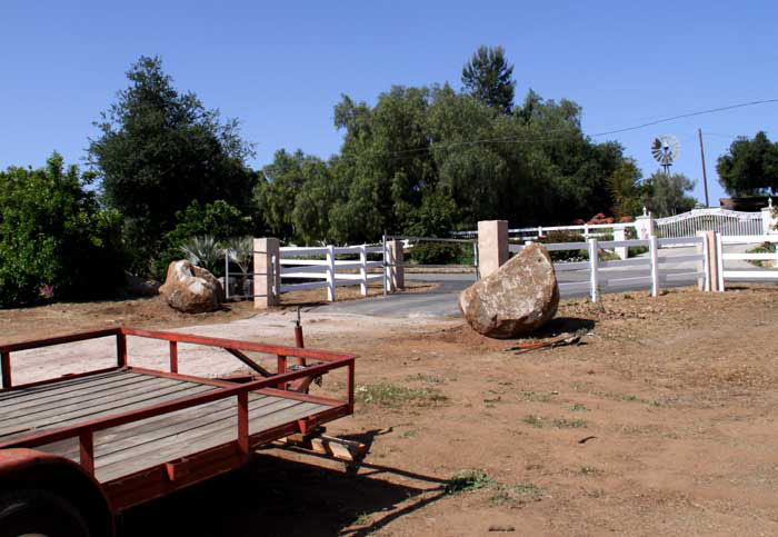 In clearing the palms off of the farm, we uncovered two beautiful boulders down near the bottom. Petra loves rocks (especially massive, unwieldy ones) and was insistent that they be relocated up the hill to frame the entranceway. They are granite and even heavier than we expected.