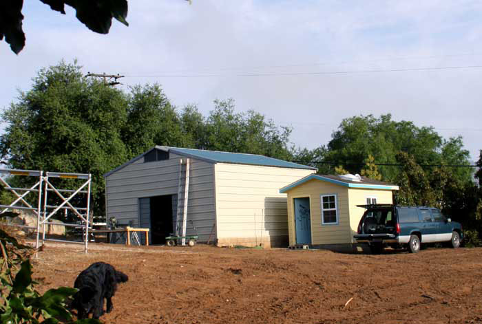 Escrow finally closed on March 17. To set up Petra's new 3/4-acre "farm," we first had to get the nurseryman to clear his palms off of that part of the property, which took some time. In the interum, we fixed up the "No-tell Motel," adding a twin bed, counter, fridge, microwave and, of course, a coffee maker. Petra now has a cozy place to stay when she's "down on the farm." We also converted the 22'x24' RV port into a storage shed/workshop, which wound up being quite a job.