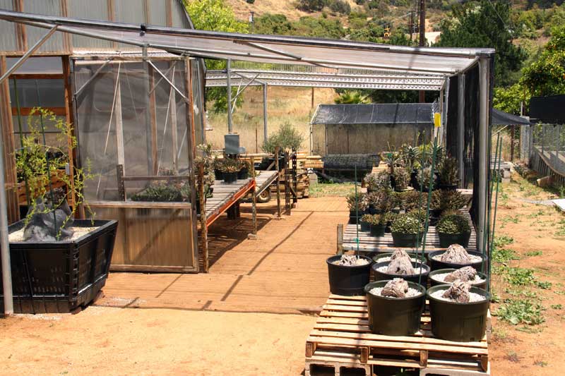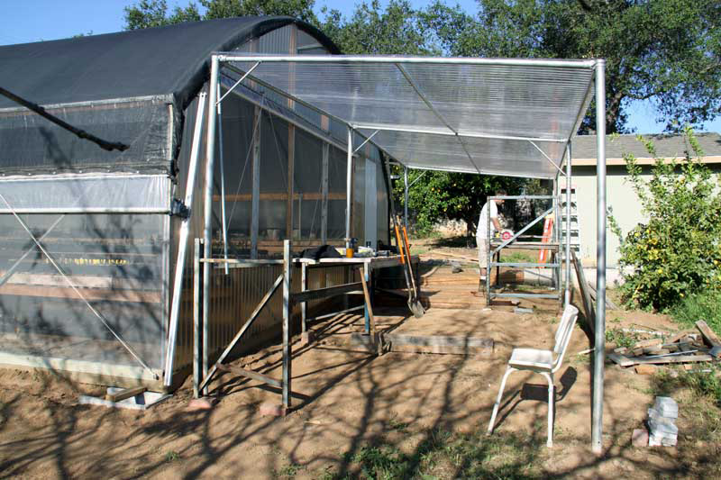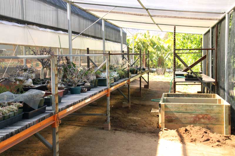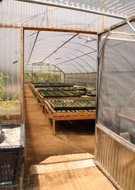 The shade area at the north end of the kinderhaus is starting to take shape. At this point we're waiting to dismantle a structure at home, so that we can use the racking to set up more tables here. This area will eventually serve as a convenient place to pot and re-pot up the baby plants growing inside.