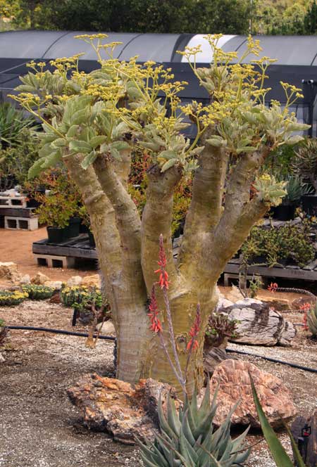 Winter is past and spring is now well advanced. This is our favorite time of the year, when all the summer growers come out of dormancy and spring to verdant life. This season has been a little wierd: overall cooler than normal, but also with wide variations in daytime temperatures. It will go from sunny in the mid-80s one day to overcast in the low 60s the next. This has confused many plants; they don't seem to know whether it's time to leaf and/or blossom out or not. Fortunately our big cyphostemma was not among the confused. It made its commitment early and strong and we are now enjoying the spectacle of its annual spring display.