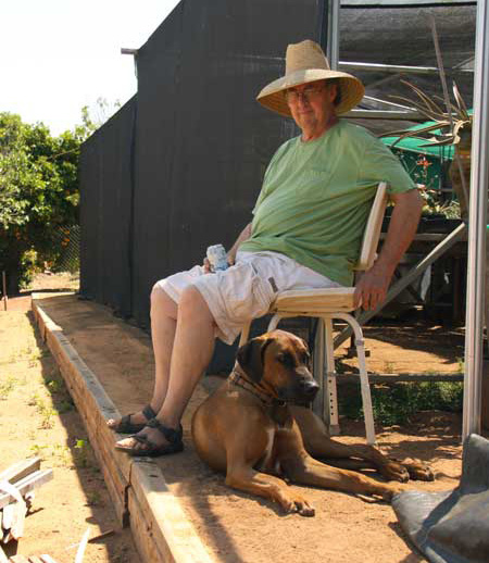Paul poses in his favorite role as supervisor, watching over the labors of his two teenage workers. Our faithful guard dog Rusty lays at his side, ever vigilant against the possibility of attack from rabbits or cats. Below, the terracing is complete as far as we're going to build it at this point. We'll have to wait a while for more free lumber to complete the courses, but the 240' that's now available should be enough to meet Petra's needs for the near term. She plans to devote this space to growing-on a number of species to landscaping size.