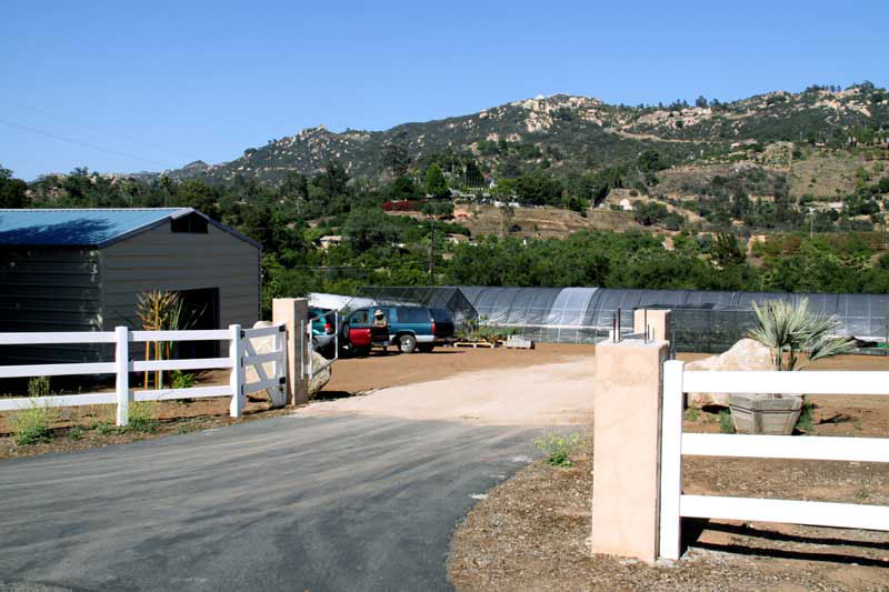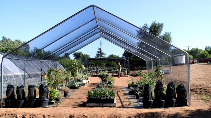 Petra stands between the two 20'x20' shade structures. We've decided to frame up the rest of the pad, creating 100' of continuous protected space, where she can vary the shade to suit the plants.