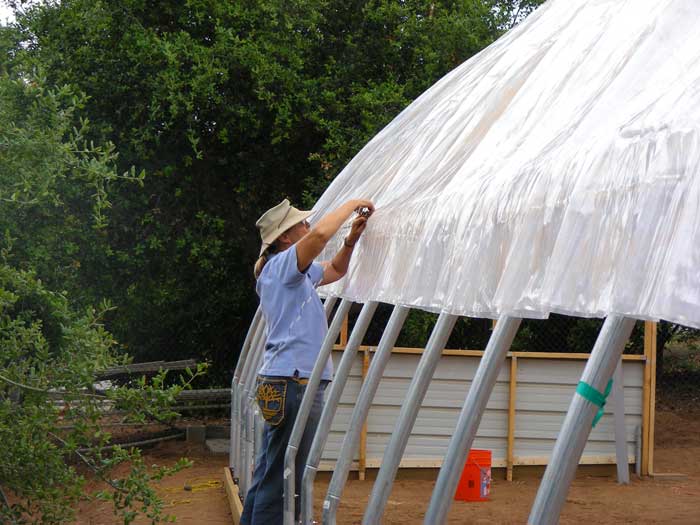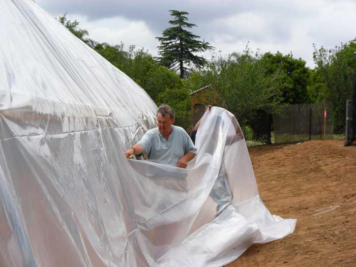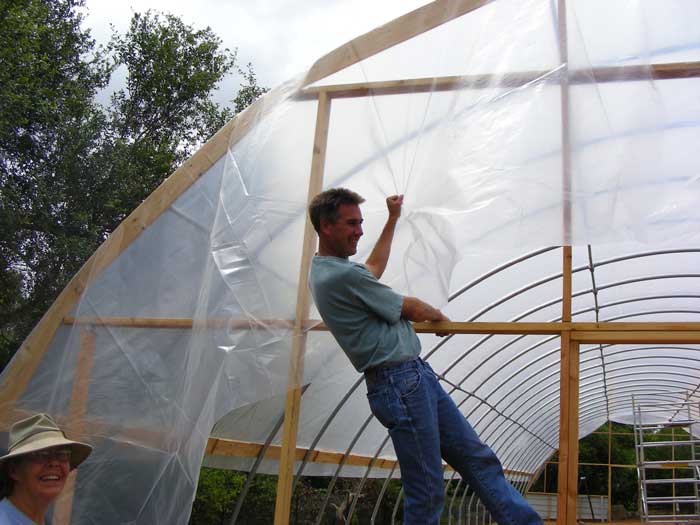 Sunday the weather was mild and the winds calm- a good time to sling plastic. Vince tensions the poly, while Petra looks pleased that we have reached this milestone.