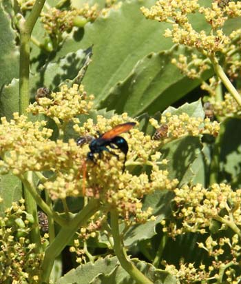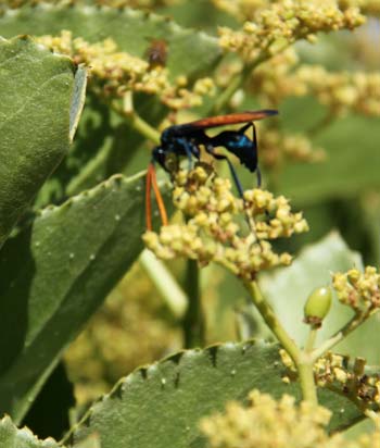 As you can see from our journal HOME page, our big Currori is in riotous bloom again this summer. On warm sunny days, it is now covered by a cloud of honey bees busily harvesting the bounty of nectar. This year we noticed that another pollinator is also taking advantage of the bloom. Tarantula hawks are visiting the plant, usually singly, but occasionally two or three at a time. At more than 1½" in length, they are much larger than any of their hymenopteran cousins and, with their distinctive orange wings and iridescent blue-black bodies, make for an arresting sight. They have no interest at all in the honey bees, who seem unperturbed by the presence of such formidable dining companions. The bees do however stay out of the way, leaving the wasps to feed at leisure wherever they want.