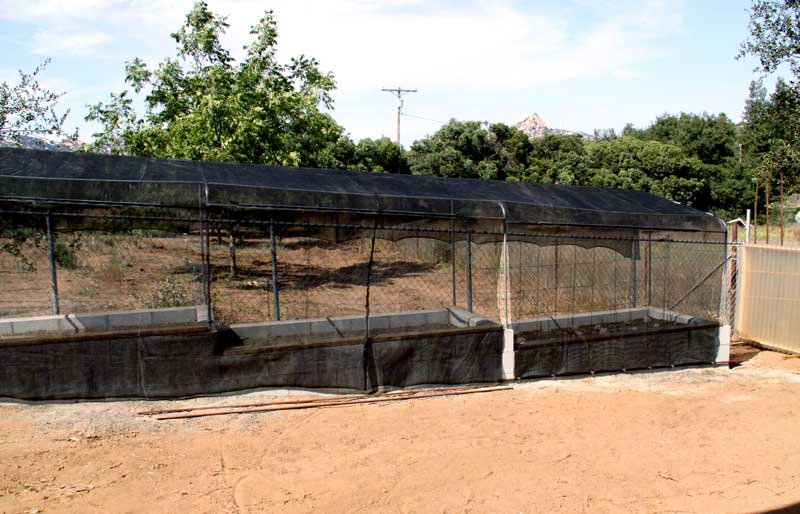 A view of the shade structure level with the framed-up ground beds in the background. We put in an electric line down the length of the greenhouse and plan to install air circulation fans within the next week or two.