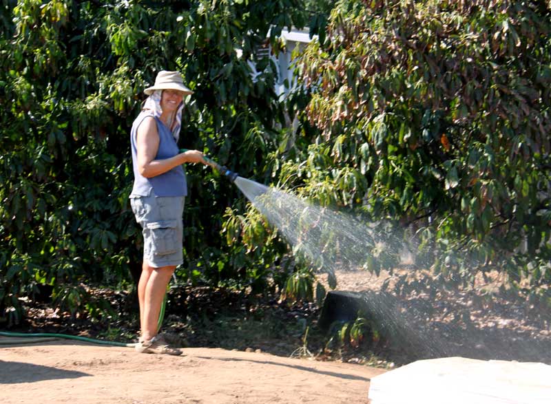 Petra waters the avocado trees out back of the no-tell motel. This is her R&R in the late afternoon when it becomes too hot to work.